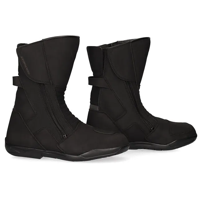 Independently CE Certified boot for peace of mind. The waterproof / breathable liner keeps your feed dry from the elements and lets hot air out so you don?t sweat up a storm, all while protected from abrasion and impact by Nubuck and cow leather. When it comes to protection, leather is the perfect solution for abrasion resistance in case of a fall. The high grip sole keeps your feet where they need to be and the TecnoGi toe and heel inserts protect you against impact by keeping the boot in shape in event of a crash. For comfort and usability the Deuce WP includes a dual closure system. This allows you to unzip both sides of the boot to easily slide your foot in and is great if you have ankle mobility issues. There is an extension area at the rear of the boot for those with larger calves, or if you like to have pants tucked in ? Upper: Nubuck leather, PU Nubuck stretch panel ? Dual opening for ease of entry with inner tube ? Velcro expansion point at calf ? Dual YKK zipper closure ? Polyester lining with PU foam padding ? Waterproof membrane ? PU soft insock ? Plastic and felt covered insole ? Tecno GI?? thermoplastic toecap and heel ? Moulded nylon, padded ankle guard ? Leather gear change pad ? Reinforced shin plate ? CE Certified EN 13634:2017