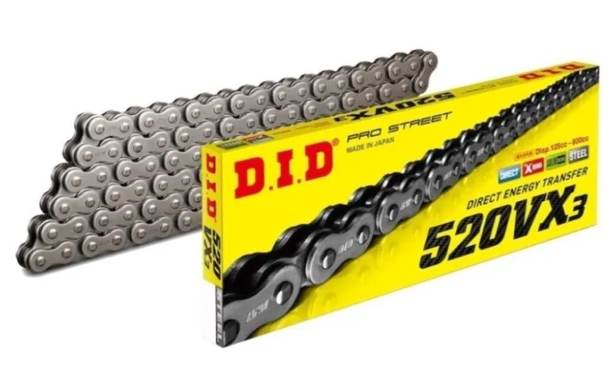 The VX Series chain is a great chain upgrade from OEM and is our most popular and widely used chain on both on and off-road bikes. The 520VX3 boasts a 32% longer chain life than the VO Series due to our patented X-Ring seal technology. It also has increased rigidity as to reduce flex, which gives you a more responsive and smooth driving experience.
