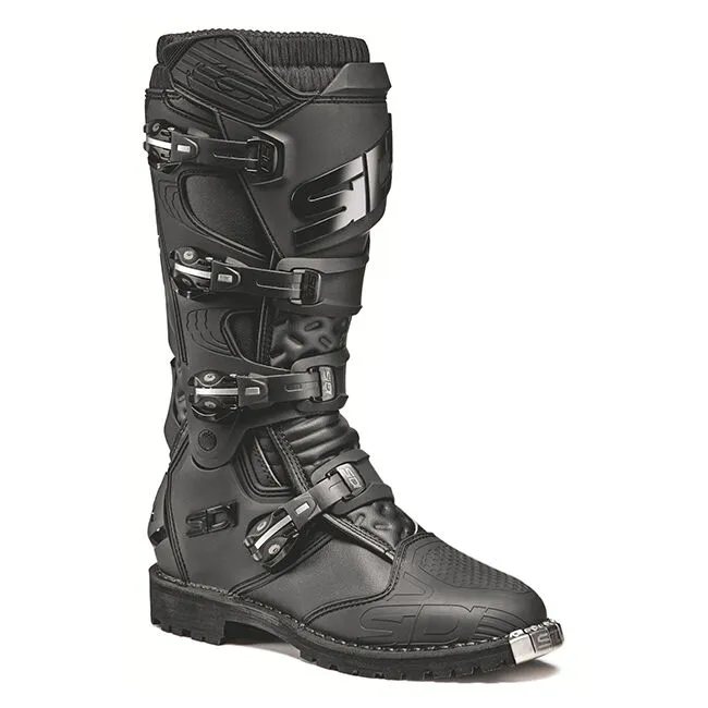 Lightweight enduro boots The X-Power range of boots are lightweight for off-road use, with increased lateral protection to prevent ankle and calf injury. The Enduro is made with waterproof technomicro microfibre and plastic protection on the shin plate. The four buckle closure ensures a secure fit, while the soft lining assists with all-day riding; the inner side of the boots has a smooth design to encourage better motorcycle grip and contact. The inner calf features anti-slip protection and a heat proof insert. All buckles and the buckle pad are replaceable. The Enduro sole is extremely flexible with deep grooves for grip on and off the bike. A metal toecap protects the front of the boot. The flex system positioned on the ankle allows great flexion, which is controlled and limited through a mechanism placed inside the hinge; the back flexion is also limited thanks to the plastic shaped on the rear of the boot. Importantly, the X-Power range is CE certified to EN 13634. Sidi X POWER ENDURO boots ? Made with Technomicro microfiber and plastic protections, the X-Power Enduro also features a soft lining that facilitates fit and enhances comfort ? The ENDURO sole offers grip in all offroad conditions ? The tongue and the back joint are made with microfiber and thermoformed. ? The X-Power Enduro uses a 4-buckle closure system ? The micrometric memory adjustment straps and hooks are easily replaceable. ? All inner gaiter seals the leg from dust and debris. ? All buckles are protected by a buckle pad, the one on the ankle can be replaced together with the buckle. ? The flex system positioned on the ankle is provided great flexion, which is controlled and limited through a mechanism placed inside the hinge. ? The back flexion is also limited thanks to the plastic shaped on to enhance this goal. ? The calf protector has an anti-slip rubber insert and is heat-proof. ? The inside area of the boots has a smooth design specifically studied for better contact and grip with the motorcycle. ? Homologated according to EN 13634